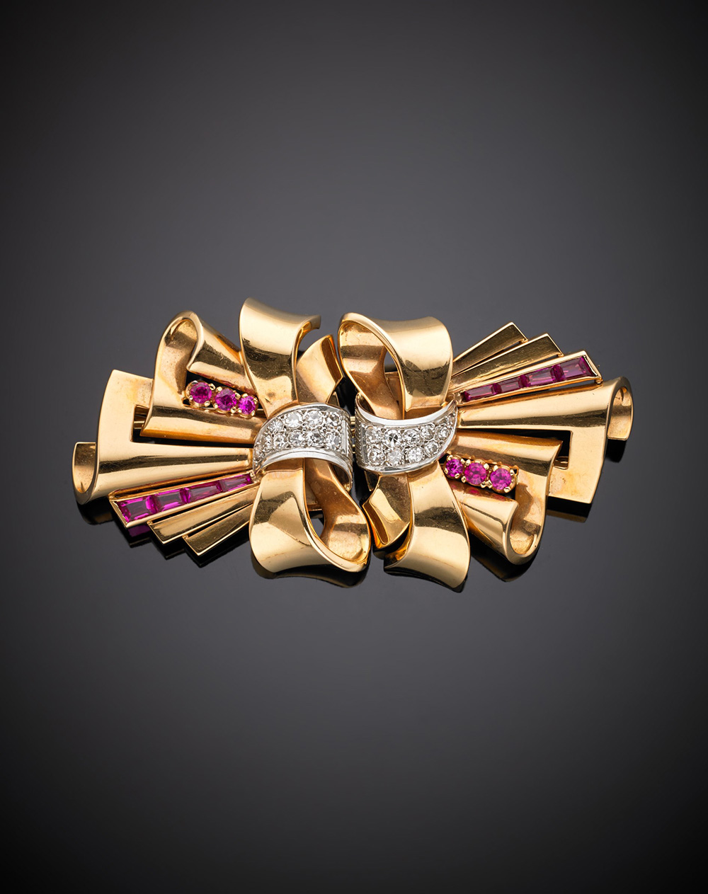 Doppia broche in oro giallo con rubini rotondi, baguette e tapered rifinita...