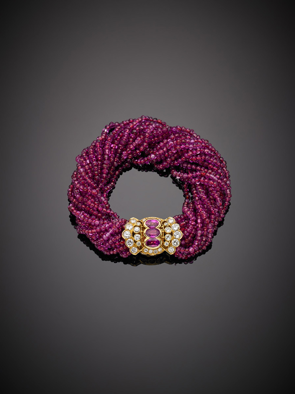 Bracciale a più fili in boules di rubini con chiusura in oro giallo, diamanti...