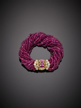 Bracciale a più fili in boules di rubini con chiusura in oro giallo, diamanti rotondi e rubini ovali, g.41,00 lungh. cm 19,8 circa Multi-strand faceted ruby bead bracelet with yellow gold diamond and ruby clasp, g.41,00 length. cm 19,8 circa