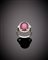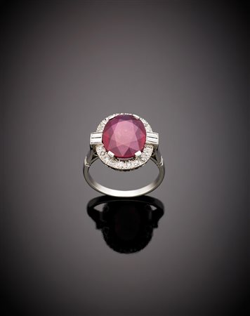 Anello in oro bianco con rubino ovale di ct. 4,80 circa con contorno di diamanti rotondi e a baguette, g.6,80, misura 14/54 White gold diamond and ct.4,80 ruby cluster ring, g.6,80, size 14/54