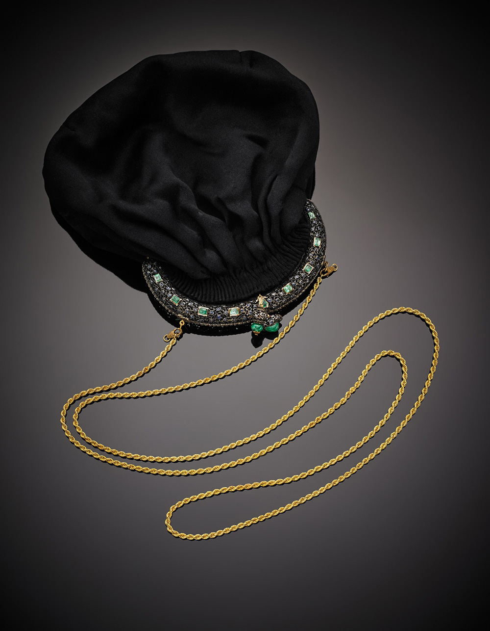 BUCCELLATI MILANO Borsetta da sera in cotone con manico in argento e oro giallo rifinita con zaffiri e smeraldi, catena a fune in oro giallo di g. 48,50, lungh. cm 118, largh. borsetta cm 18 circa (catena non pertinente) BUCCELLATI MILANO Black cotton satin vening bag with silver and gold handle accented with emeralds and sapphires, with yellow gold rope linkchain, handle width cm 11 c., bag width cm 18, linkchain g.48,50 length cm 118 (post fitting linkchain)