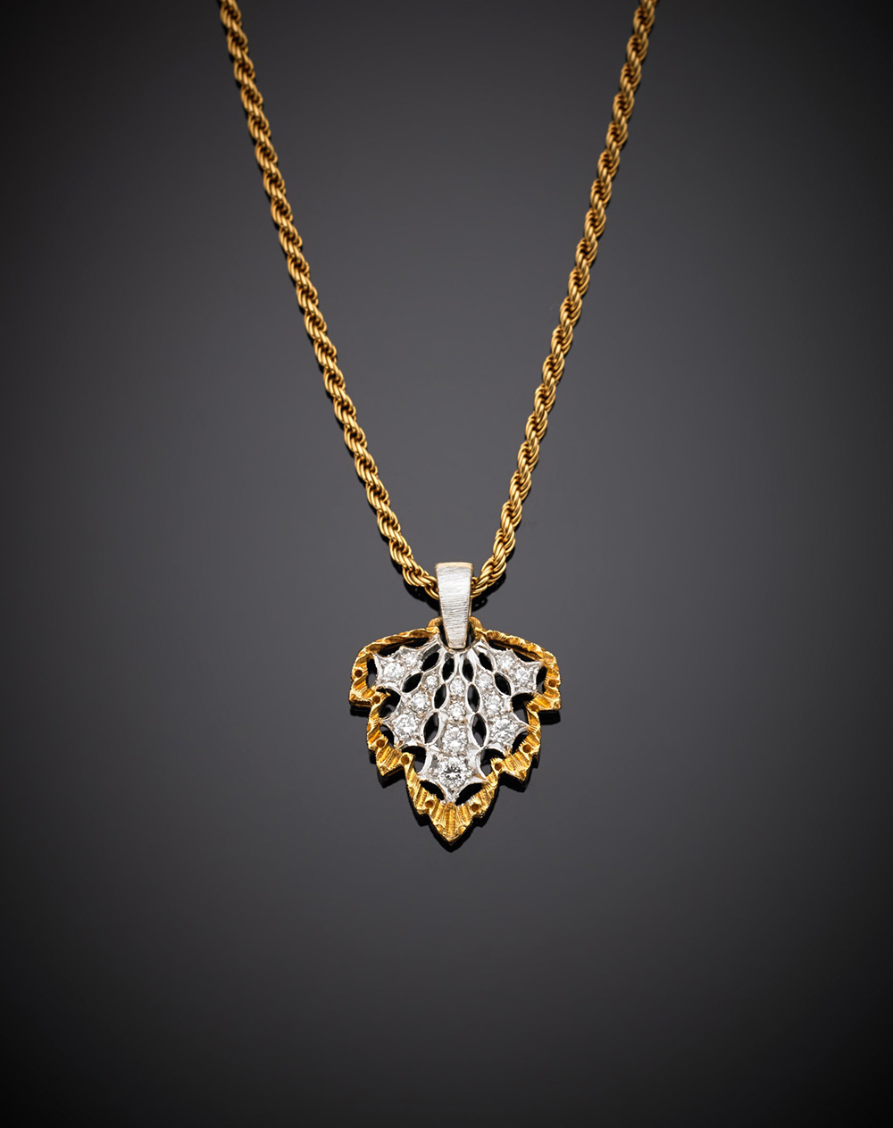 M. BUCCELLATI Pendente a guisa di foglia con catenina in oro giallo e bianco rifinito con diamanti, g. 7,10, lungh. catenina cm 42 circa. Con garanzia originale M.BUCCELLATI Bi-coloured chased gold and diamond openwork leaf pendant, g.7,10 chain length cm 42 circa. With original guarantee