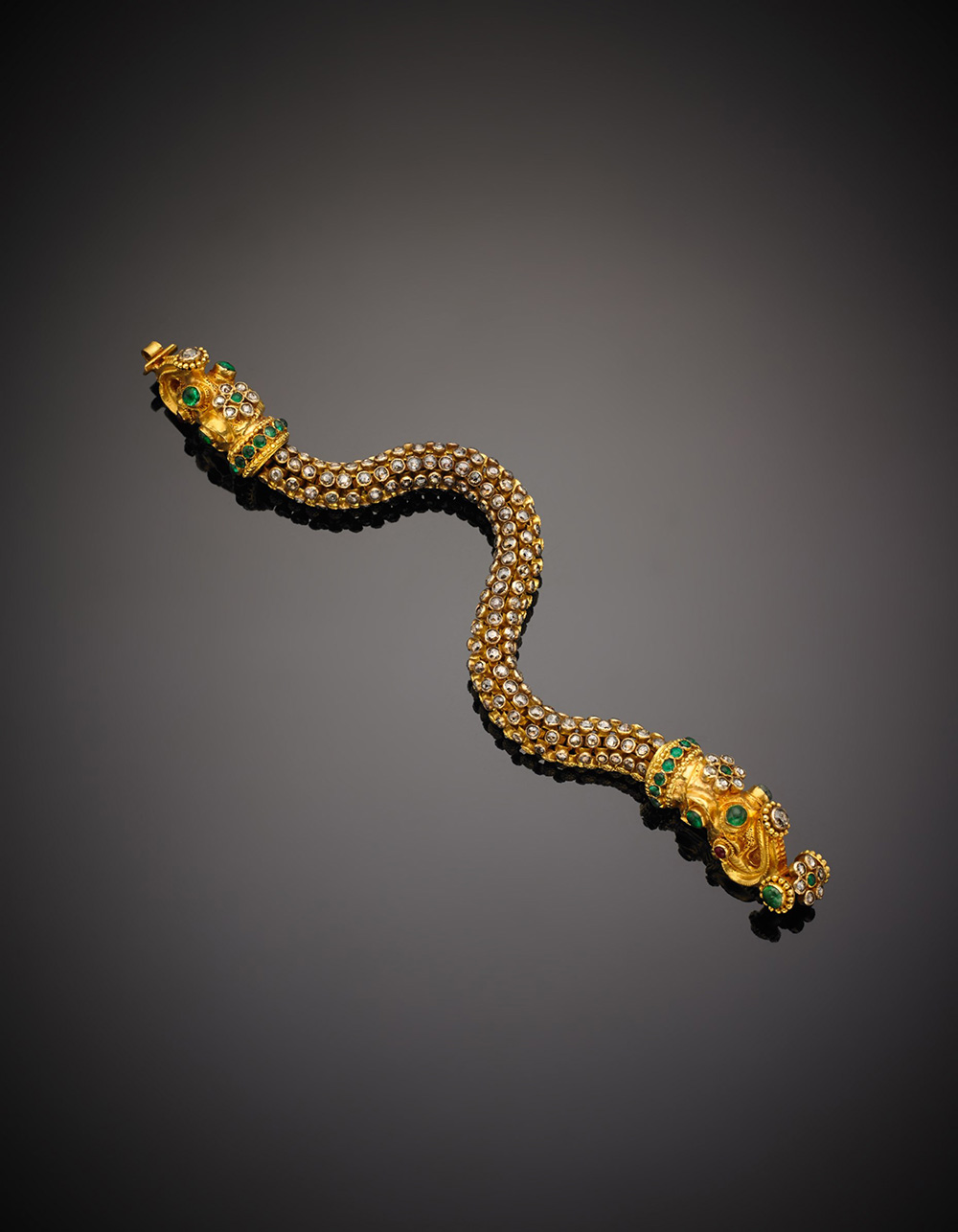Bracciale in oro giallo con diamanti, smeraldi, rubini, terminato a due teste di elefanti, g.90,90, lungh. cm 22 circa Yellow gold diamond, emerald and ruby elephant head articulated bangle, g.90,90, luength cm 22 circa