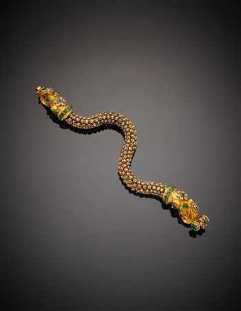 Bracciale in oro giallo con diamanti, smeraldi, rubini, terminato a due teste...