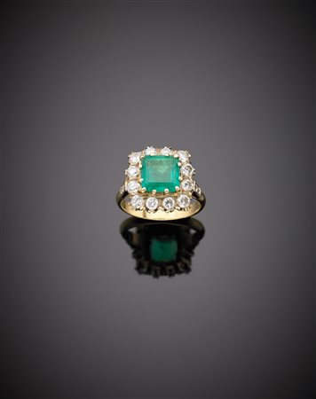 Anello in oro bianco e giallo con smeraldo quadrato di ct.2,30 circa e contorno di diamnati rotondi, g.6,40 misura 15/55 Bi-coloured gold ct.2,30 square emerald and diamond cluster ring, g.6,40 size 15/55