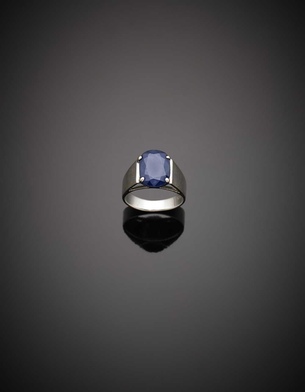 Anello in oro bianco con zaffiro ovale di ct.7,70 circa, g.5,20 misura 12/52 White gold ct.7,70 oval sapphire ring, g.5,20 size 12/52