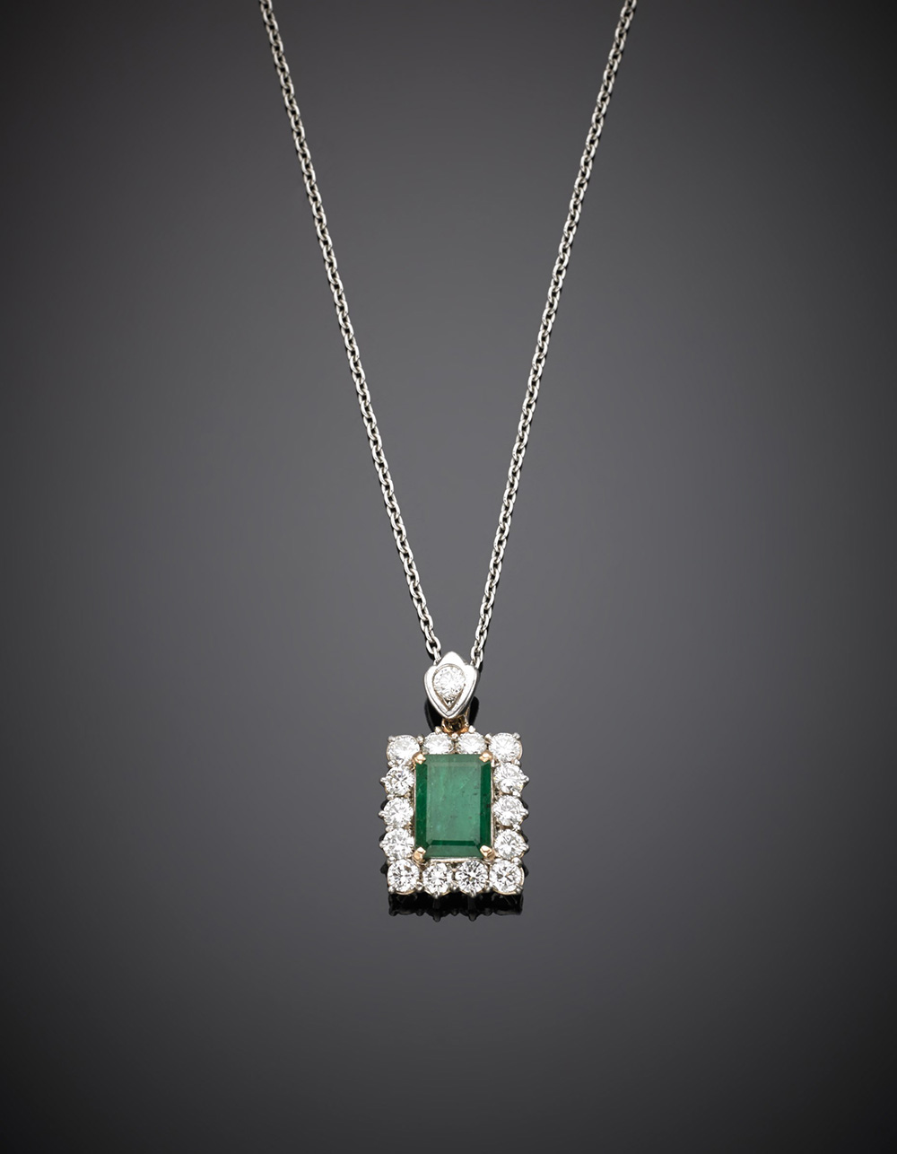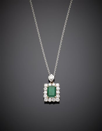 Catenina con pendente in oro bianco e giallo, smeraldo rettangolare di ct.2,20 e diamanti rotondi di contorno, g.7,50 lungh. catenina cm 41,00 circa Bi-coloured gold linkchain with a ct.2,20 rectangular emerald and diamond surround pendant, g.7,50 chain length cm 41,00 circa