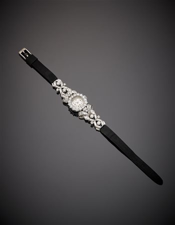GUBELIN Orologio da signora platino, diamanti e cinturino in raso nero, g.28,30 lungh. cm 20 circa GUBELIN Lady's platinum, diamond and black satin wristwatch, g.28,30 length cm 20 circa