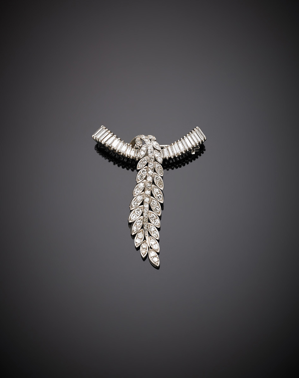 Spilla in platino con diamanti a baguette e rotondi, g. 7,90, cm 3x4 circa...