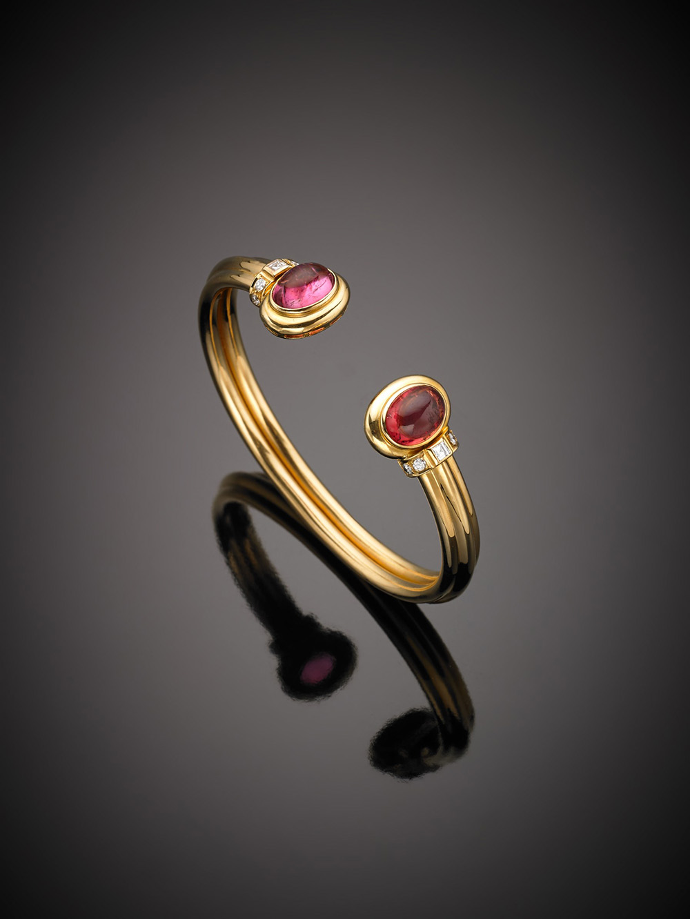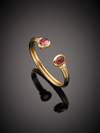 BULGARI Bracciale rigido alla schiava in oro giallo, terminato da due tormaline rosa cabochon e rifinito con diamanti rotondi e carrè, g. 20,60 BULGARI Yellow gold oval cabochon tourmaline diamond accented cuff bracelet, g.20,60