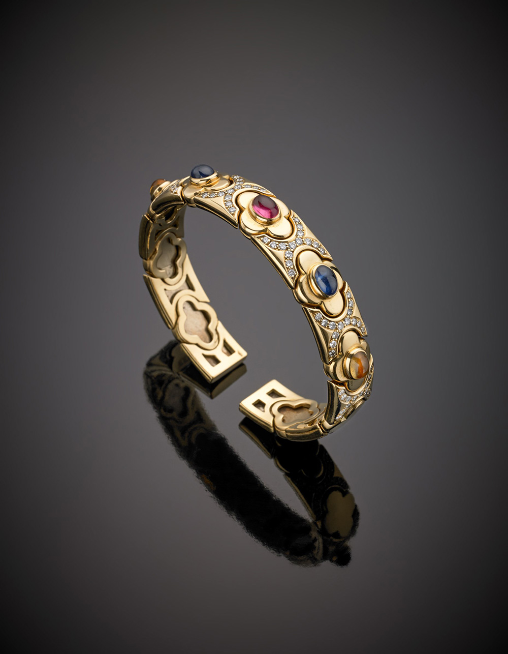 Bracciale alla schiava semirigido in oro giallo con diamanti e gemme varie ovali cabochon, g. 57,10 diam. cm 5,3 circa Yellow gold diamond and cabochon gem modular bangle, g.57,10 diam. cm 5,3 circa