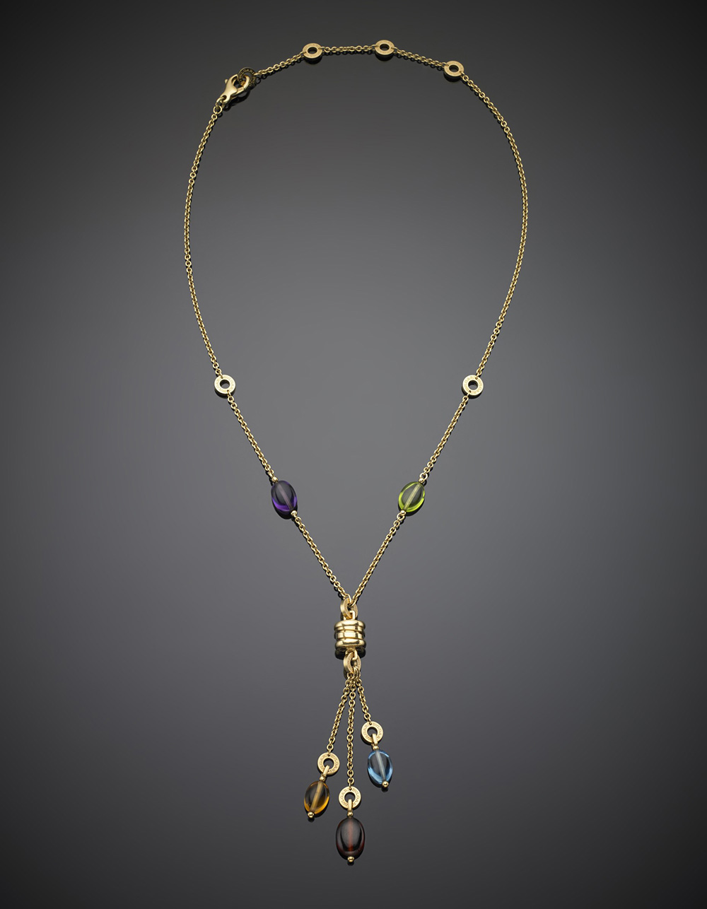 BULGARI Collier a catena con pendente in oro giallo, distanziata da boules ovali di ametista, citrino, tormalina, granato e topazio azzurro, g.19,70, lungh. collier cm 46.0, lungh. pendente cm 7,0 circa BULGARI Yellow gold necklace and pendant with amethyst, citrine, tourmaline, garnet and topaz oval beads, g.19,70 pendant length cm 7,0 c.
