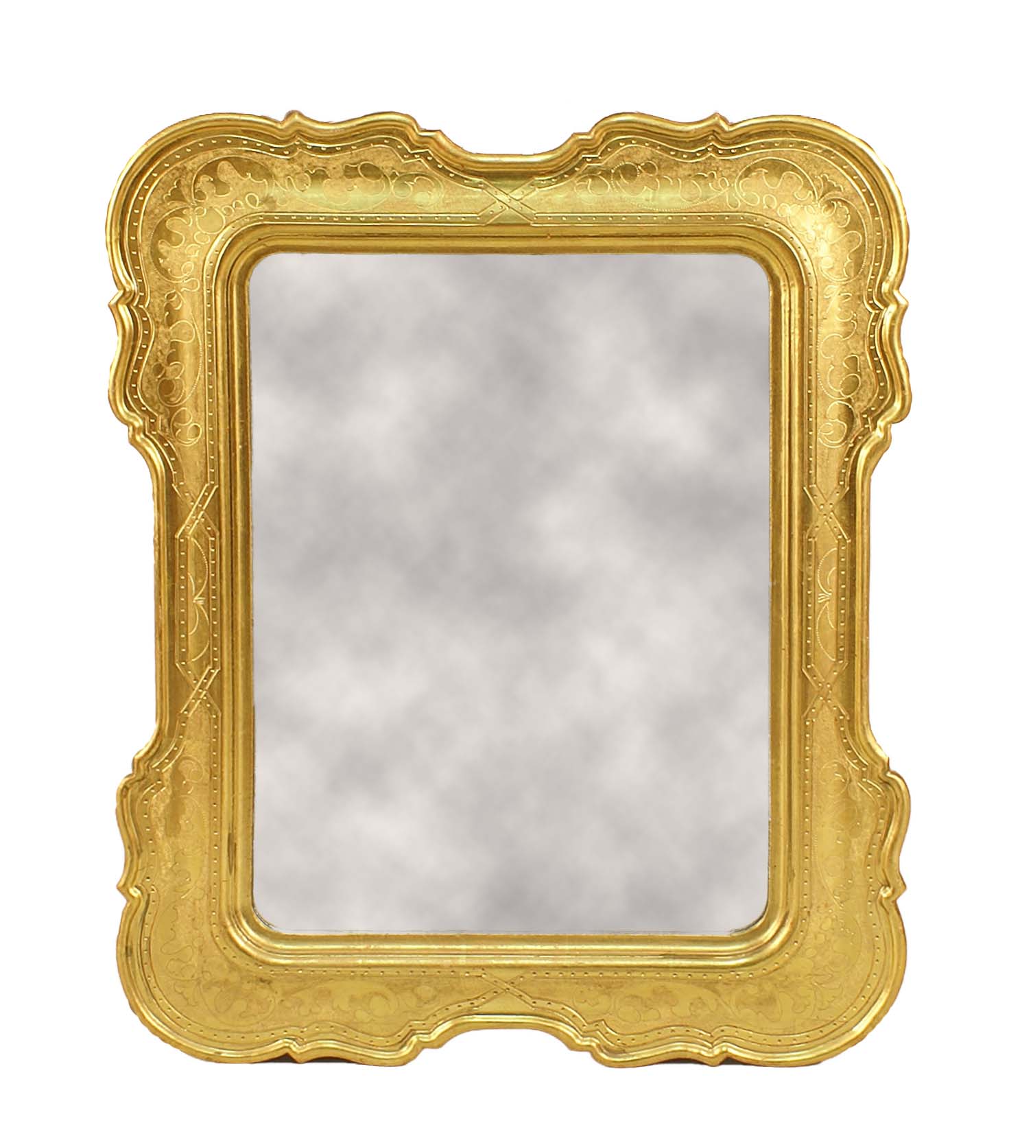 Specchiera rettangolare con cornice sagomata in legno dorato ed inciso, vecchia manifattura, cm. 90x73.