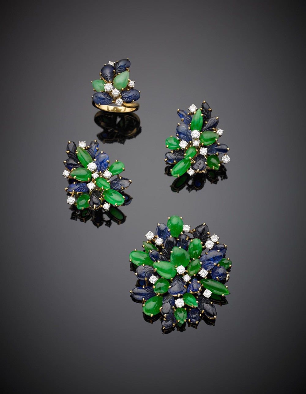 Demi-parure in oro giallo con smeraldi, zaffiri e diamanti composta da...