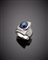 Anello in oro bianco con diamanti rotondi e baguette a rifinire uno zaffiro...