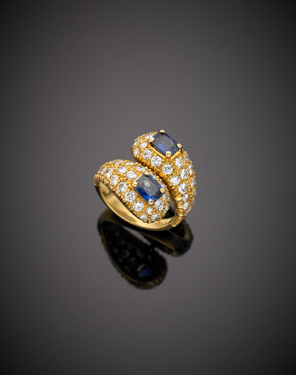MISSIAGLIA Anello in oro giallo a contrarié con diamanti rotondi e due zaffiri ottagonali di ct. 0,85 cadauno circa, g.9,10, misura 12/52 MISSIAGLIA Cross-over yellow gold ring with round diamonds and two octagonal sapphires of ct.0,85 circa each, g. 9,10 size 12/52