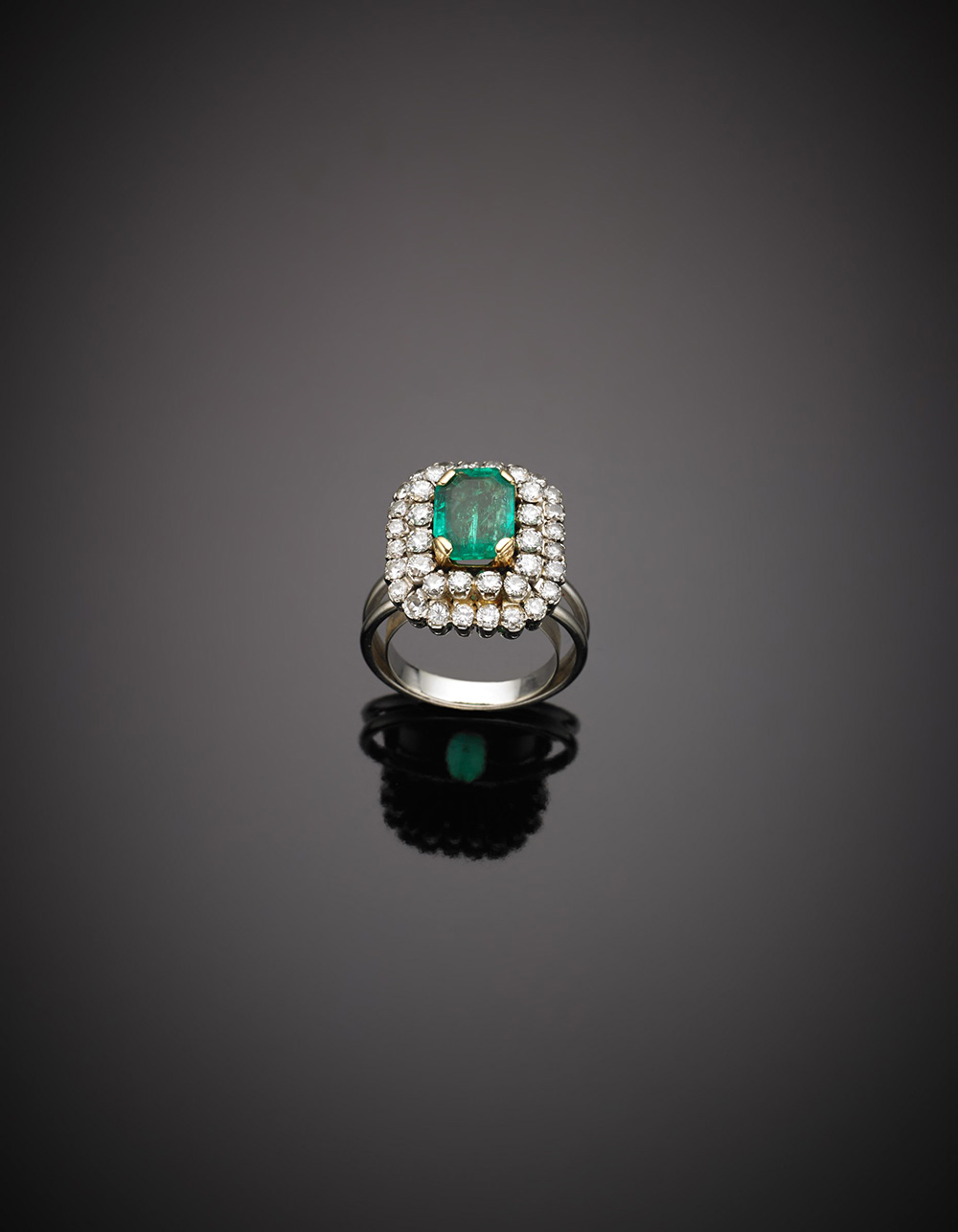 Anello in oro bianco con smeraldo di ct.1,80 circa contornato da diamanti, g.9,40 misura 16/56 White gold diamond and ct.1,80 emerald ring, g.9,40 size 16/56