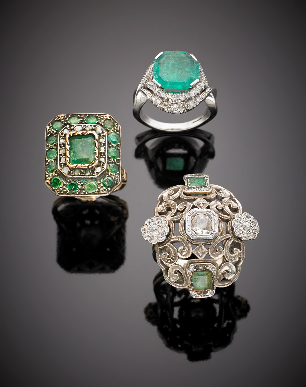 Lotto di tre anelli in oro bianco giallo e argento con diamanti e smeraldi, di misure diverse, complessivi g.32,30 Lot of three bi-coloured gold and silver diamond and emerald rings of different sizes, in all g. 32,30