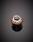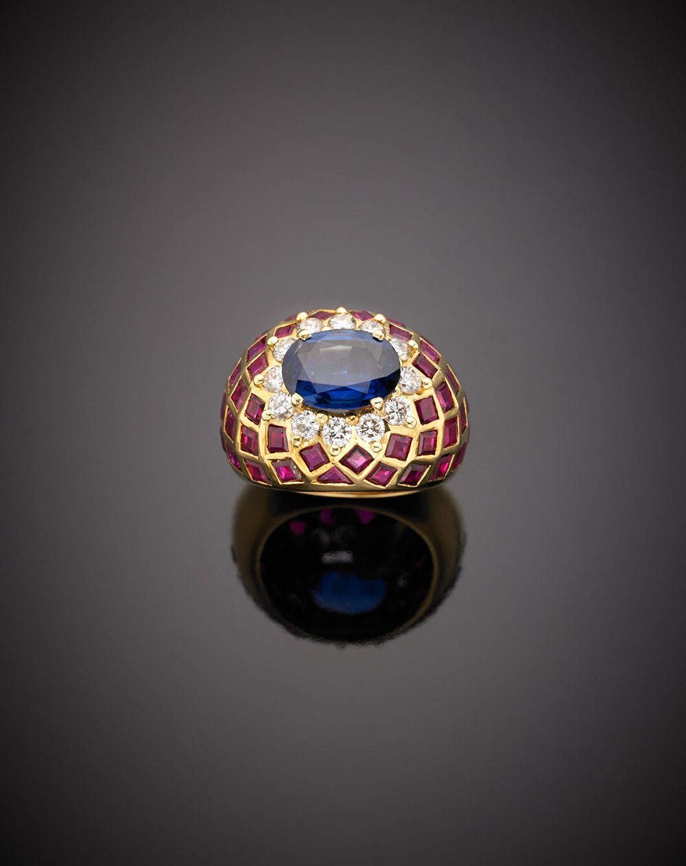 Anello in oro giallo con rubini carrè e diamanti rotondi a contornare zaffiro ovale di ct. 2,70 circa, g. 14,90, misura 12/52 Yellow gold round diamond and carré ruby dome ring with central ct.2,70 circa oval sapphire, g. 14,90, size 12/52