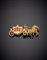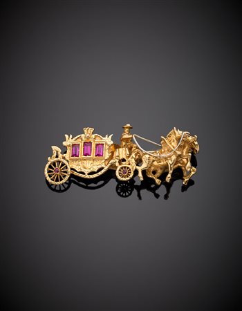 Spilla a guisa di carrozza con cavalli in oro giallo rifinita con rubini...