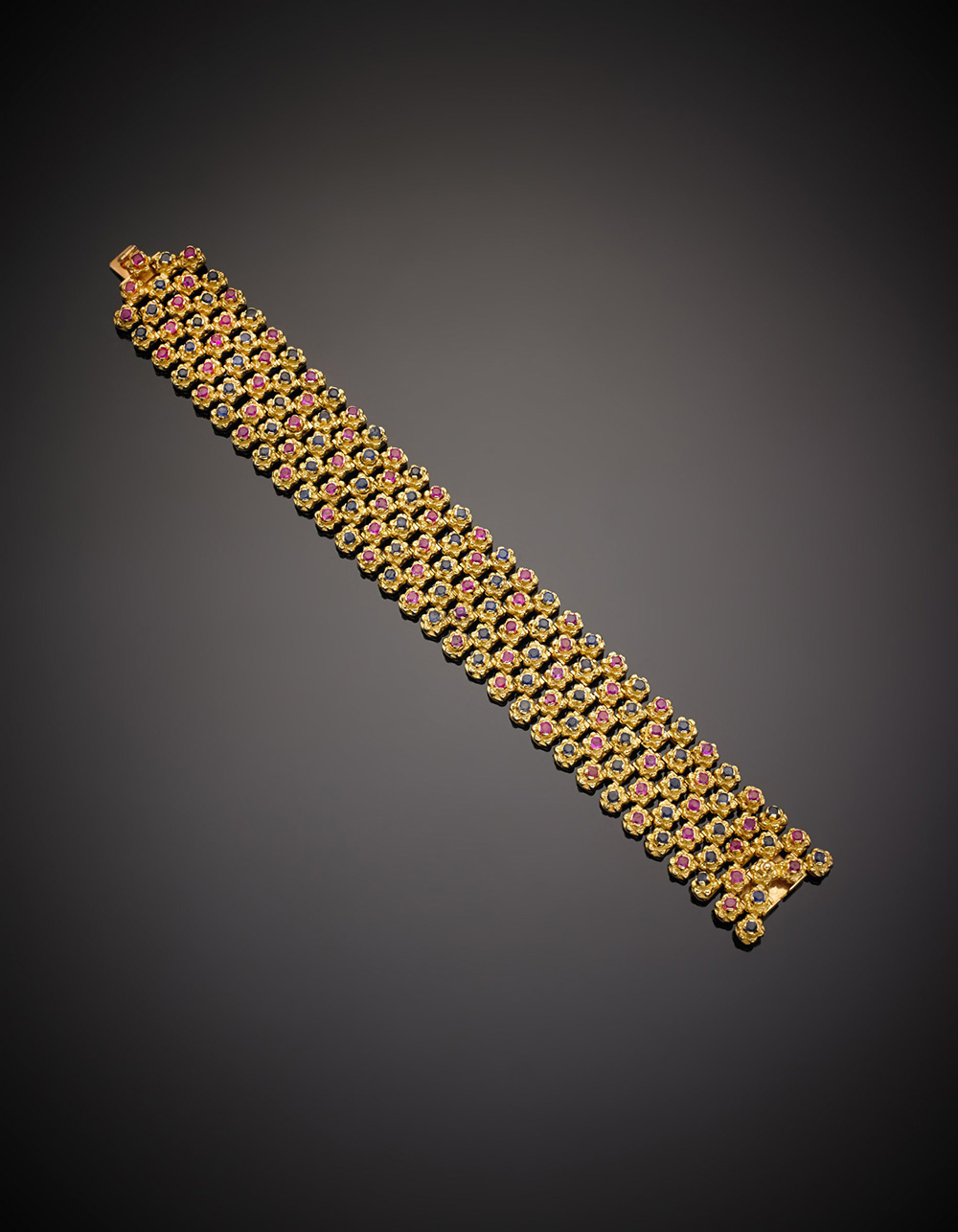 Bracciale in oro giallo a nastro con zaffiri e rubini rotondi, g.93,50 lungh....
