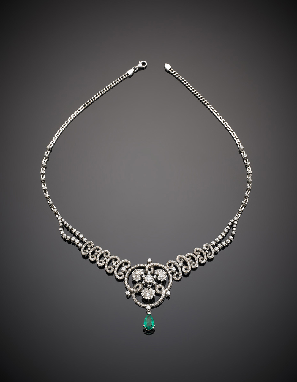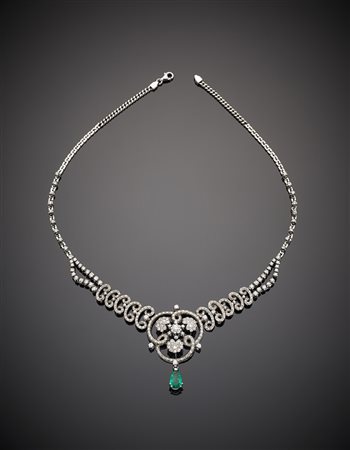 Collier in oro bianco a volute con diamanti e un pendente a goccia di smeraldo di ct.1,50 circa, g.41,20 lungh. cm 44 circa White gold diamond volute necklace with a ct.1,50 circa emerald drop pendant, g.41,20 length cm 44 circa