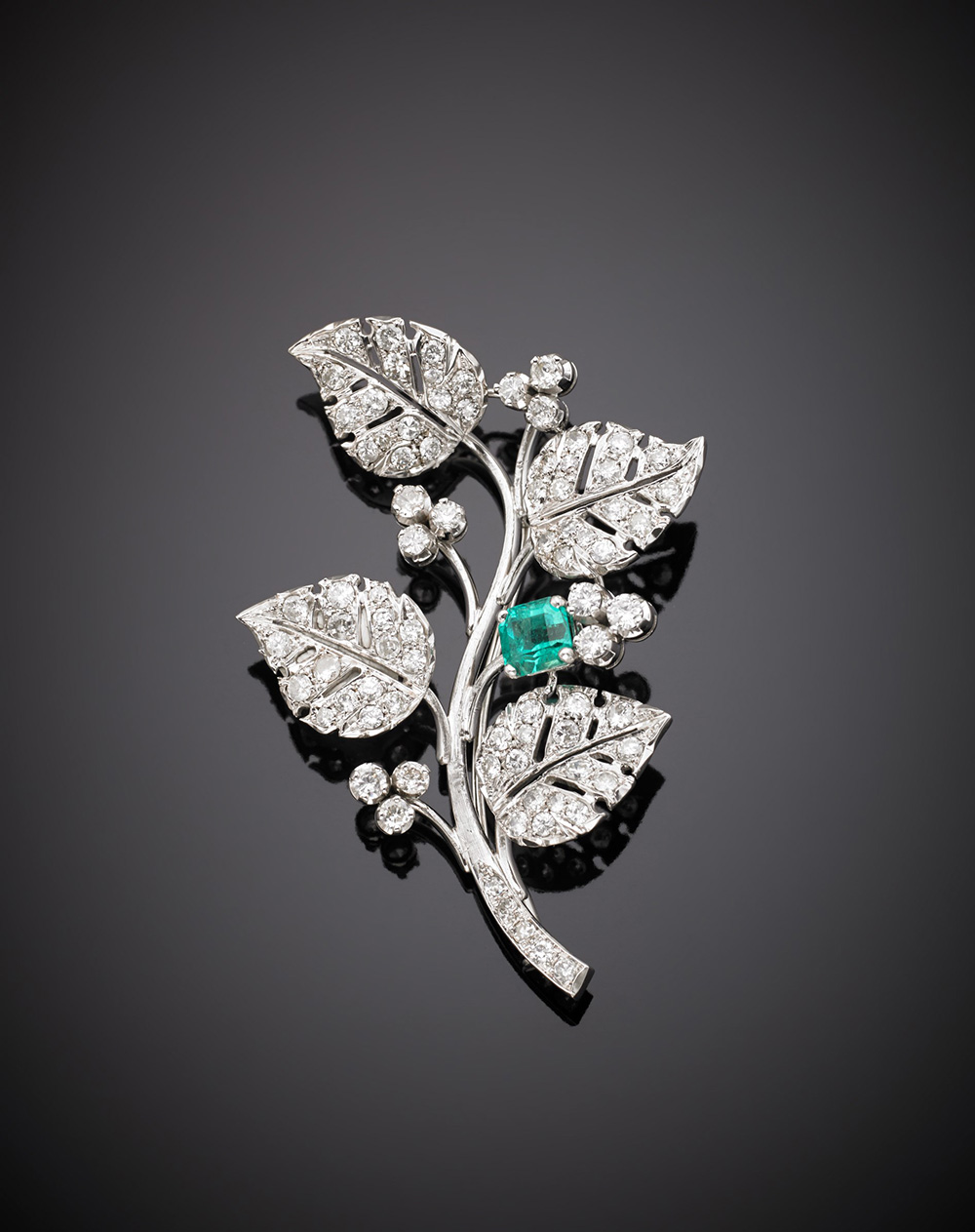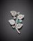 Spilla floreale in oro bianco con diamanti e smeraldo ottagonale, g. 13,70, lungh. cm 6,20 circa White gold and diamond floral brooch with octagonal emerald g. 13,70 length cm 6,20 c.