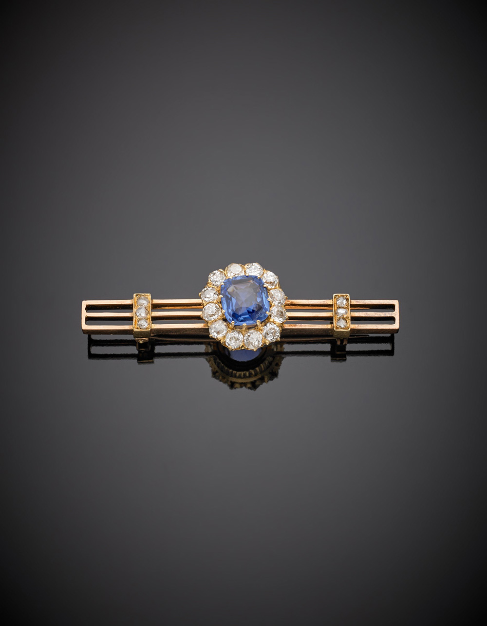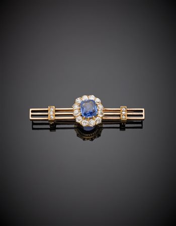 Spilla a barretta in oro giallo e rosa con diamanti rotondi e al centro uno zaffiro taglio a cuscino di ct. 2,40 circa g. 9,00 lungh. cm 5,0 circa Accompagnato da analisi gemmologica del CISGEM report n. 5181 del 23/01/2017 Milano Pink and yellow gold diamond brooch with a central cushion cut sapphire of ct.2,40 circa, g.9,00 length cm 5 circa Appended Gemmological Report CISGEM n. 5181 23/01/2017 Milano