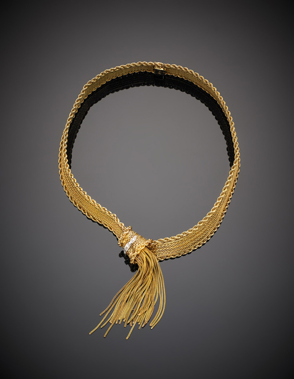Collier in oro giallo con nodo centrale finito a nappa e rifinito in oro bianco e diamanti, g.121,60 lungh. cm 40,3 circa, marchi "civetta" e Breveté . Attribuito a MARCHAK Yellow gold necklace with central knot and tassel accented in white gold and diamonds, g.121,60 length cm 40,3 circa, french hallmarks. Attributed to MARCHAK