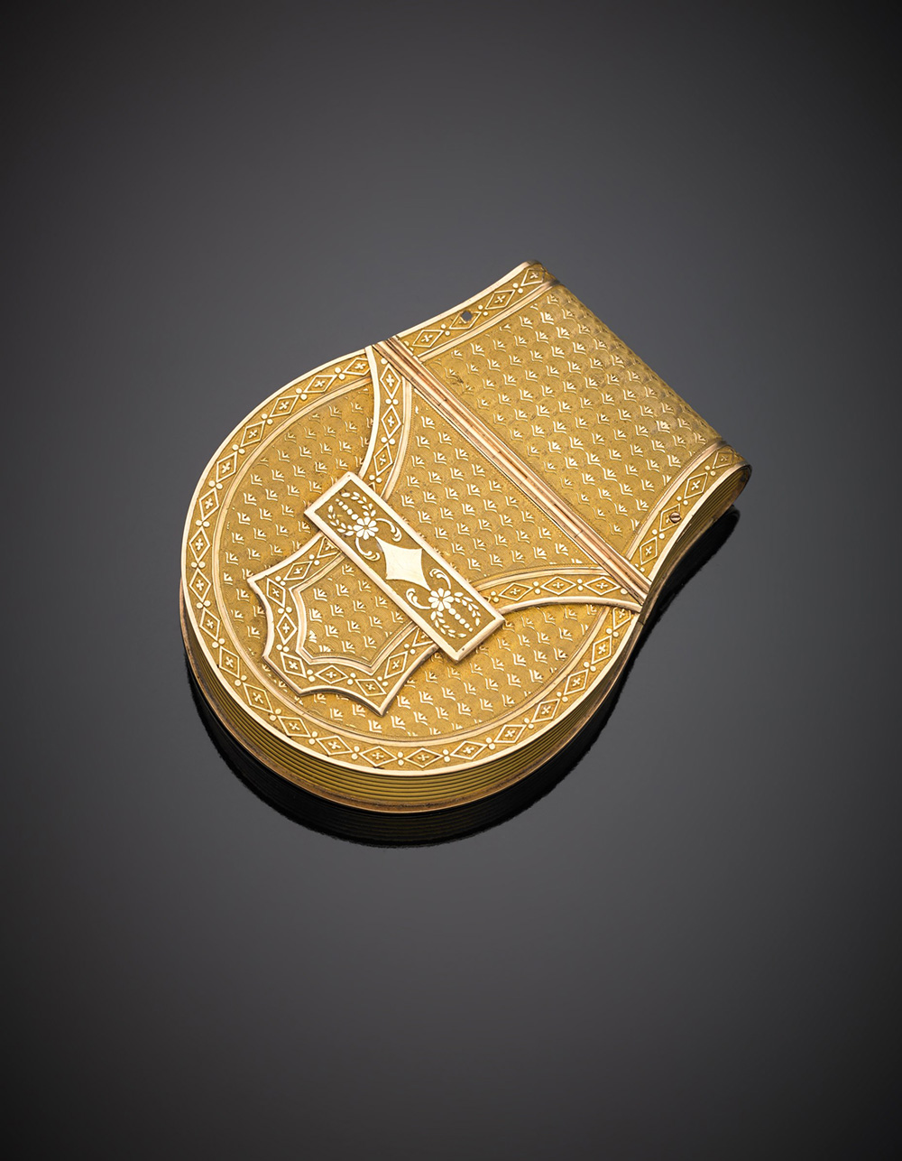 Scatola portapillole con carrillon in oro giallo cesellato, g. 79,10 in scatola originale Yellow chiselled gold carrillon pill box, g.79,10 in original case