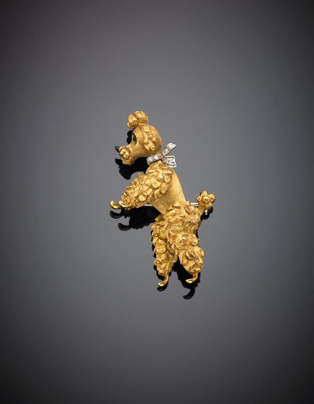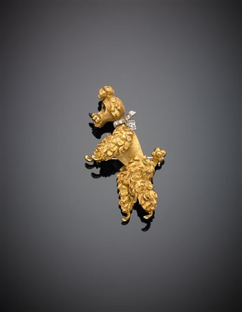 Broche a guisa di barboncino in oro giallo satinato e rigato rifinito in onice, oro bianco e diamanti, con la testa movibile, g.22,00 lungh. cm 5,2 circa Yellow glazed and chiselled gold poodle brooch, white gold onyx and diamond accented, with loose head, g.22,00 length cm 5,2 circa