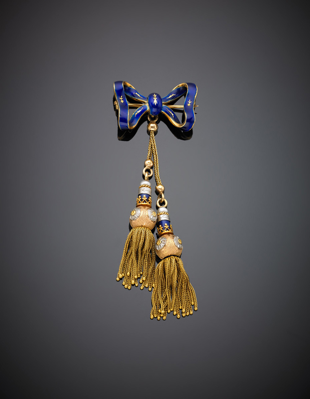 Broche a guisa di fiocco con due nappe tutto in oro giallo, bianco e rosso, rifinito con smalto blu e microperle, g.14,30 lungh. cm 7,5 Tri-coloured gold, blue enamel micro-pearl two tassel bow brooch, g.14,30 length cm 7,5