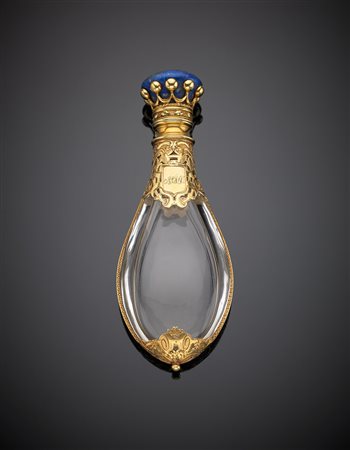 Boccetta per profumo in cristallo di rocca, oro e rifinita con tappo in lapislazzuli, incisione di lettere intrecciate e data "23 de 7bre 1856", g.80,30, lungh. cm 11,4. Punzonata con testa d'aquila, Rock crystal yellow gold bound lapis topped perfume flask, iscribed: "23 de 7bre 1856" and crossed initials, g.80,30, lungh. cm 11,4. "Eagle head" mark