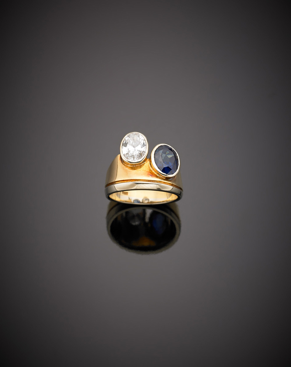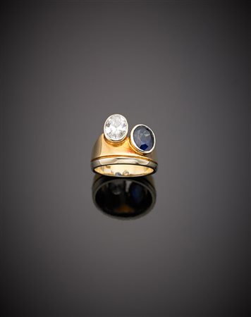 Anello in oro giallo e bianco con diamante di ct. 1,00 circa e zaffiro di ct.2,50 circa ovale, g.9,10 misura 7/47 Accompagnato da Certificato Gemmologico CISGEM Milano n.5462 del 20/02/2017 Bi-coloured gold ring with a ct.0,97 oval diamond and a ct.2,50 oval sapphire, g.9,10 size 7/47 Appended Gemmological Report CISGEM Milano n.5462 20/02/2017