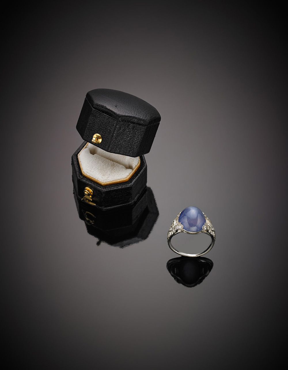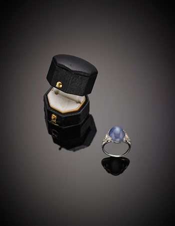 Anello in platino con diamanti rotondi, triangolari e a baguette a contornare uno zaffiro stellato ovale cabochon di ct.13 circa, g. 7,30, misura 11,5/51,5. In astuccio originale Platinum diamond and a ct.13 circa oval cabochon star sapphire ring, g.7,30 size 11,5/51,5. In original case