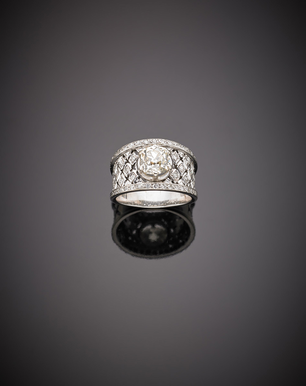 Anello in oro bianco a fascia traforata con diamante centrale di ct 1,15 circa, g.7,00 misura 14/54 White gold diamond openwork band ring with a central ct.1,15 circa diamond, g.7,00 size 14/54