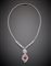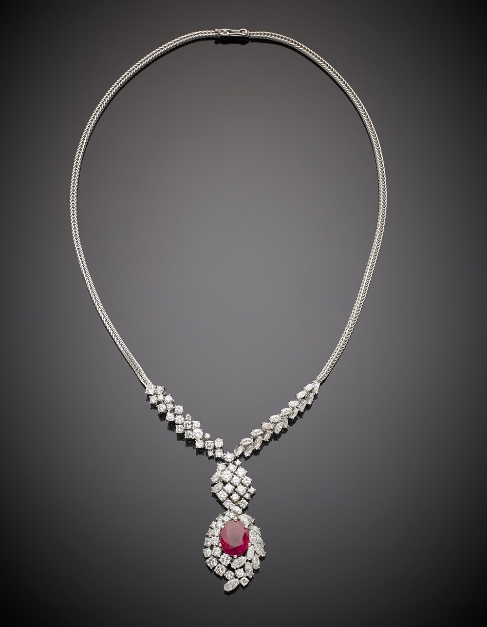 Collier con pendente in oro bianco, diamanti rotondi e a navette con al centro un rubino ovale di ct. 5,80 circa, g.27,90, lungh. cm 45 circa White gold round and marquise cut diamond, oval ct.5,80 ruby necklace, g.27,90, length. cm 45 circa