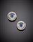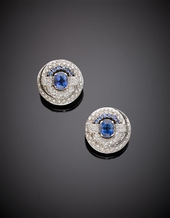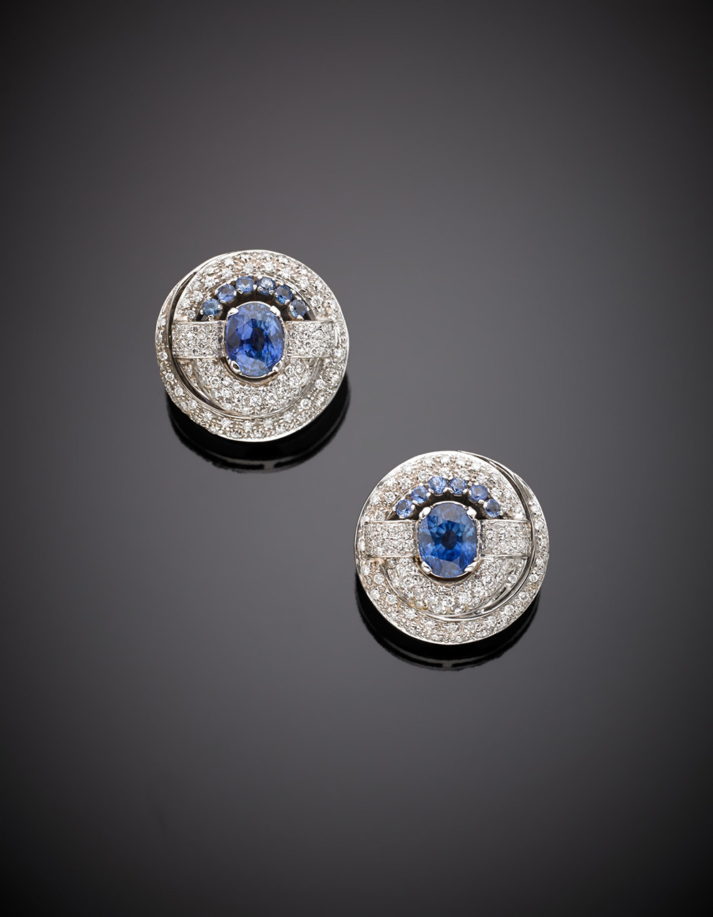 Orecchini a lobo con perno e clip in oro bianco con diamanti e zaffiri a contornare due zaffiri ovali di ct. 3,70 ciascuno circa, g. 25,90, diam. cm 2,5 circa White gold, diamond and sapphire earrings each centered by an oval sapphire of ct.3,70 c., g. 25,90 diam. cm 2,5