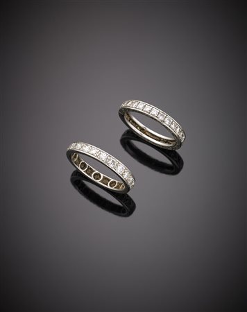 Lotto di due fedine "eternity" in oro bianco e diamanti, g.8,50 misura 14/54 e 18/58 Lot of two white gold and diamond "eternity" rings, g.8,50 size 14/54 and 18/58