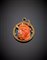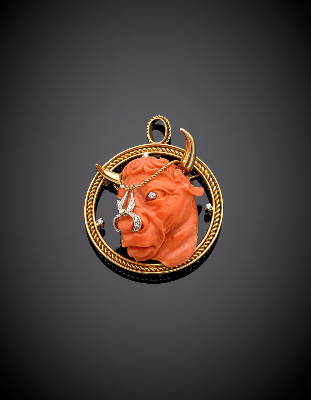 TORRINI Pendente/spilla a guisa di testa di toro, in oro giallo in corallo arancione scolpito rifinita con diamanti, g.49,30, diam. cm 5 circa TORRINI Yellow gold carved orange coral diamond accented bull's head brooch, g.49,30, diam. cm 5 circa