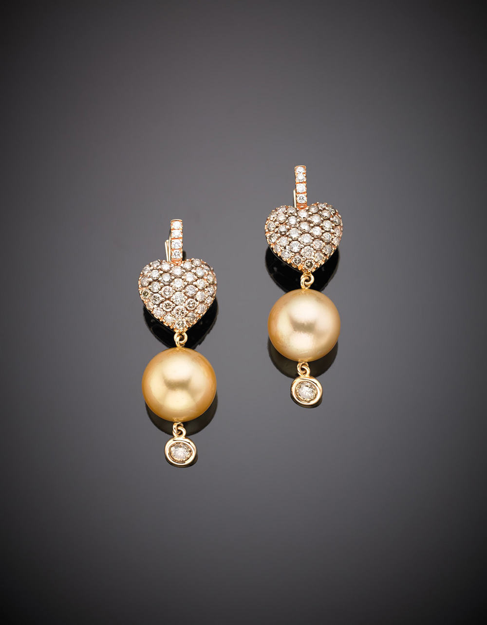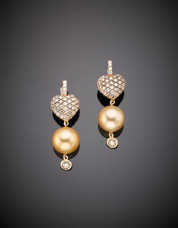 Orecchini pendenti in oro rosa con diamanti rotondi e due perle South-sea gold di mm 13 circa, g. 16,60, lungh. cm 4 circa Pink gold and diamond pendant earrings with two golden South-sea pearls of mm 13, g. 16,60 length cm 4,0 c.