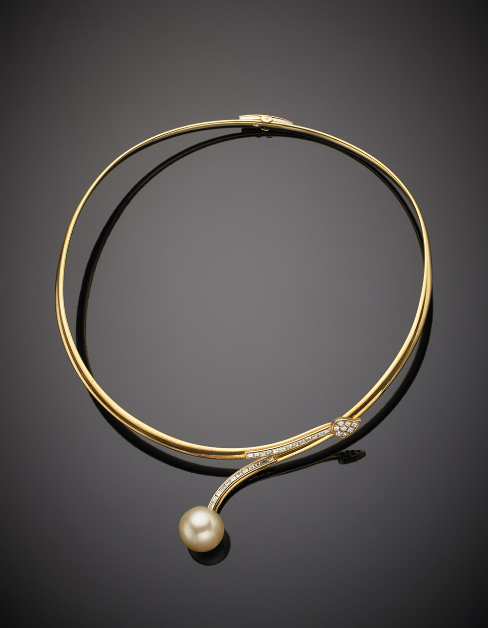 Collier rigido in oro giallo con diamanti rotondi e baguette terminato con una perla gold South-sea di mm 13,50 color crema, g. 41,50 Yellow gold diamond torque with a gold South-sea cream coloured pearl of mm 13,50 , g.41,50