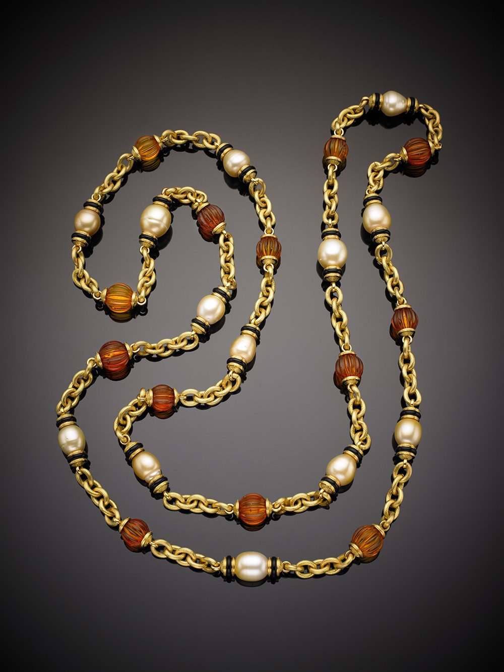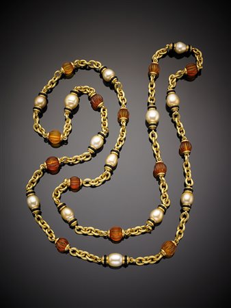 Collana con catena in oro giallo zigrinato con perle South-sea, boules di ambra costolate e distanziatori in onice, g.277,30 lungh. cm 158 circa Yellow chiselled gold, golden South-sea pearl, carved amber bead and onyx spacer necklace, g.277,30 length cm 158 circa