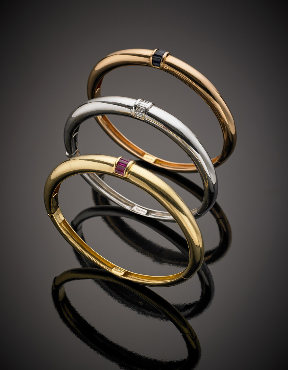 Tre bracciali rigidi in oro a tre colori centrati con diamanti, zaffiri e rubini a baguette, g.83,70 diam. cm 5,8 Three bangles in red, white and yellow gold accented with diamonds, sapphires and ruby baguettes, g.83,70 diam. cm 5,8