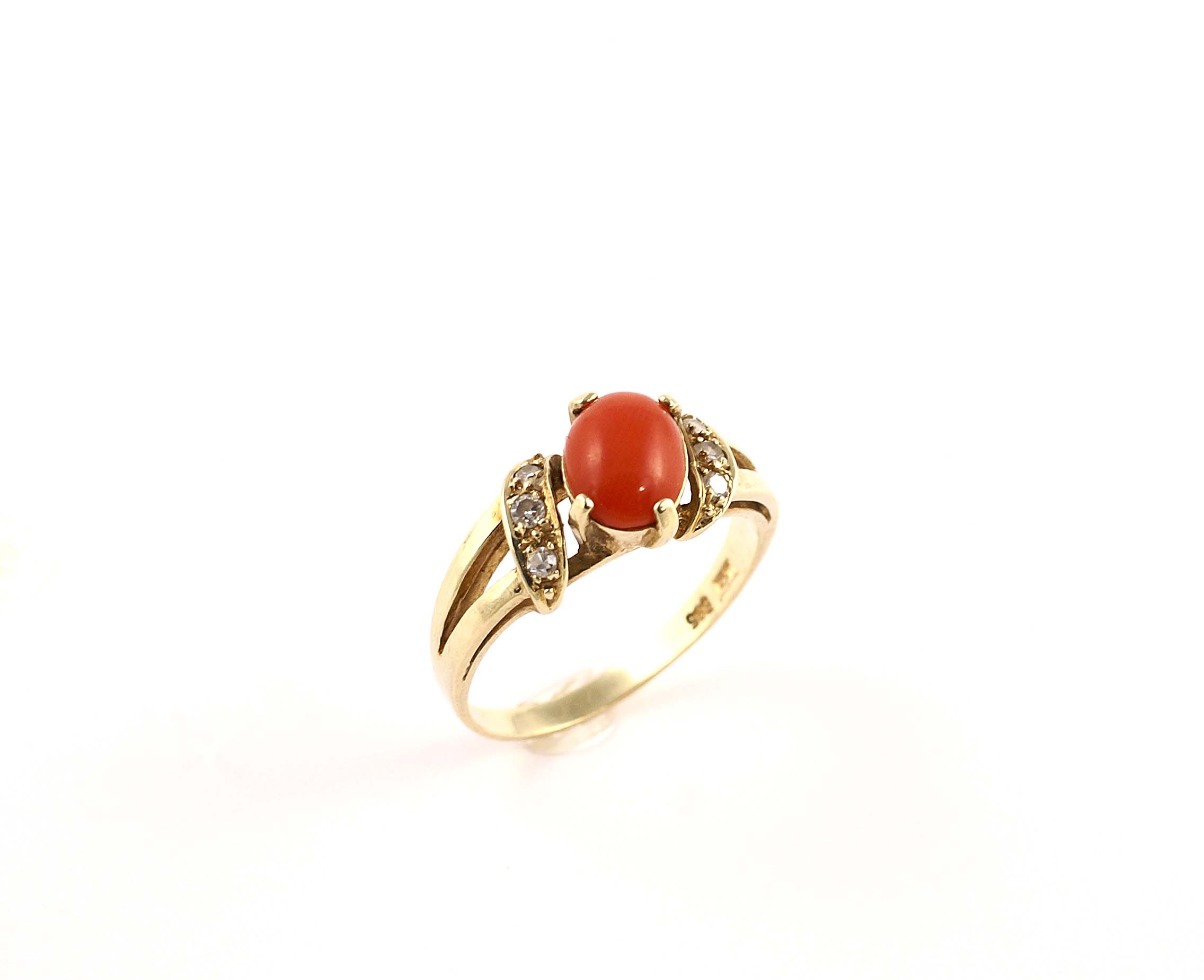 Anello in oro giallo 18kt con al centro corallo rosso di forma ovale e ai lati sei diamanti taglio brillante per 0,08 punti circa, anni 50/60, gr. 3.