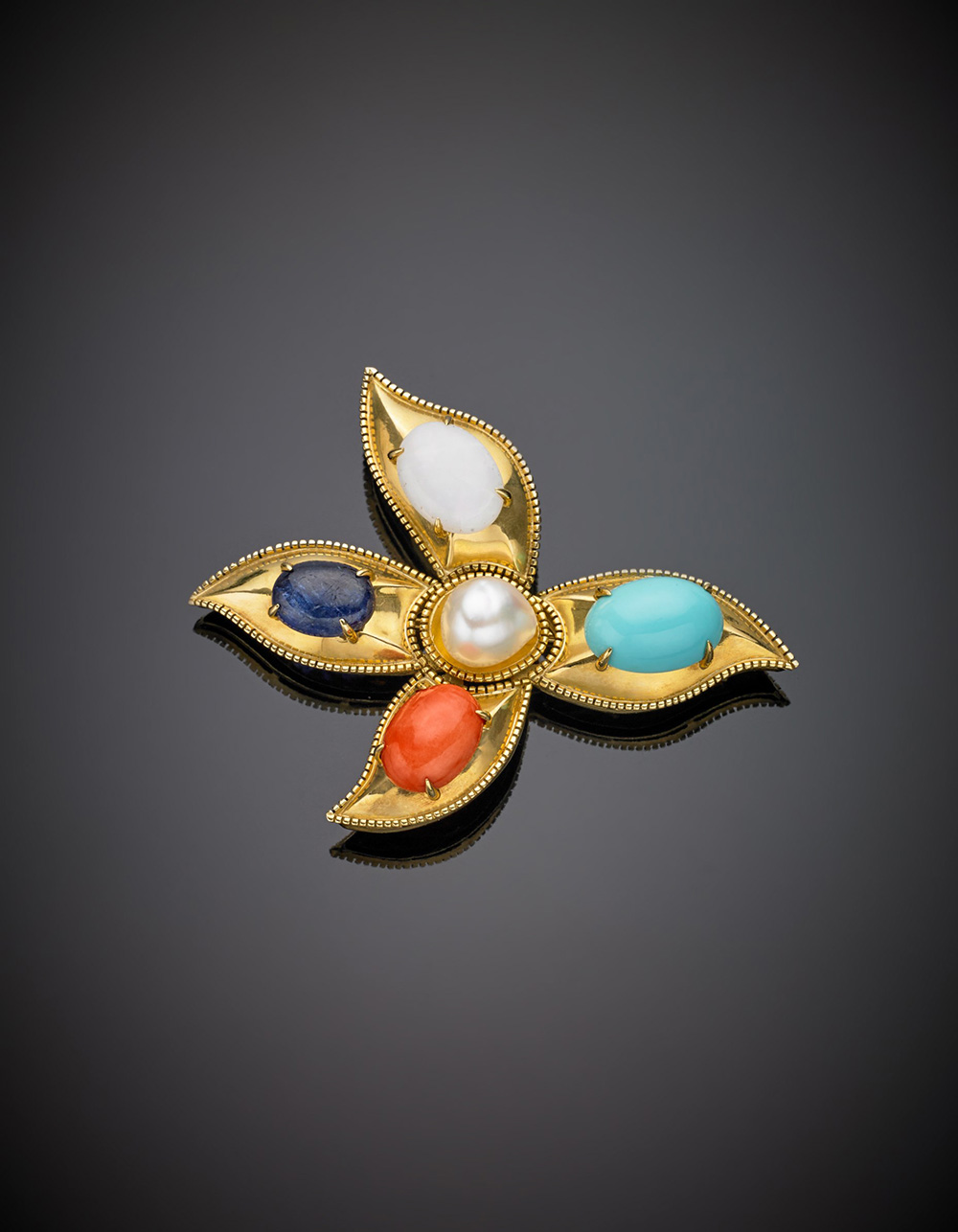 MISSIAGLIA Spilla riproduzione "Pala d'oro" in oro giallo a quattro petali con opale, turchese, corallo, zaffiro e perla centrale, g.20,80, lungh. cm 6,2 MISSIAGLIA Yellow gold "Pala d'oro" reproduction four petal brooch with opal, turquoise, coral, sapphire and central pearl g.20,80 length cm 6,2