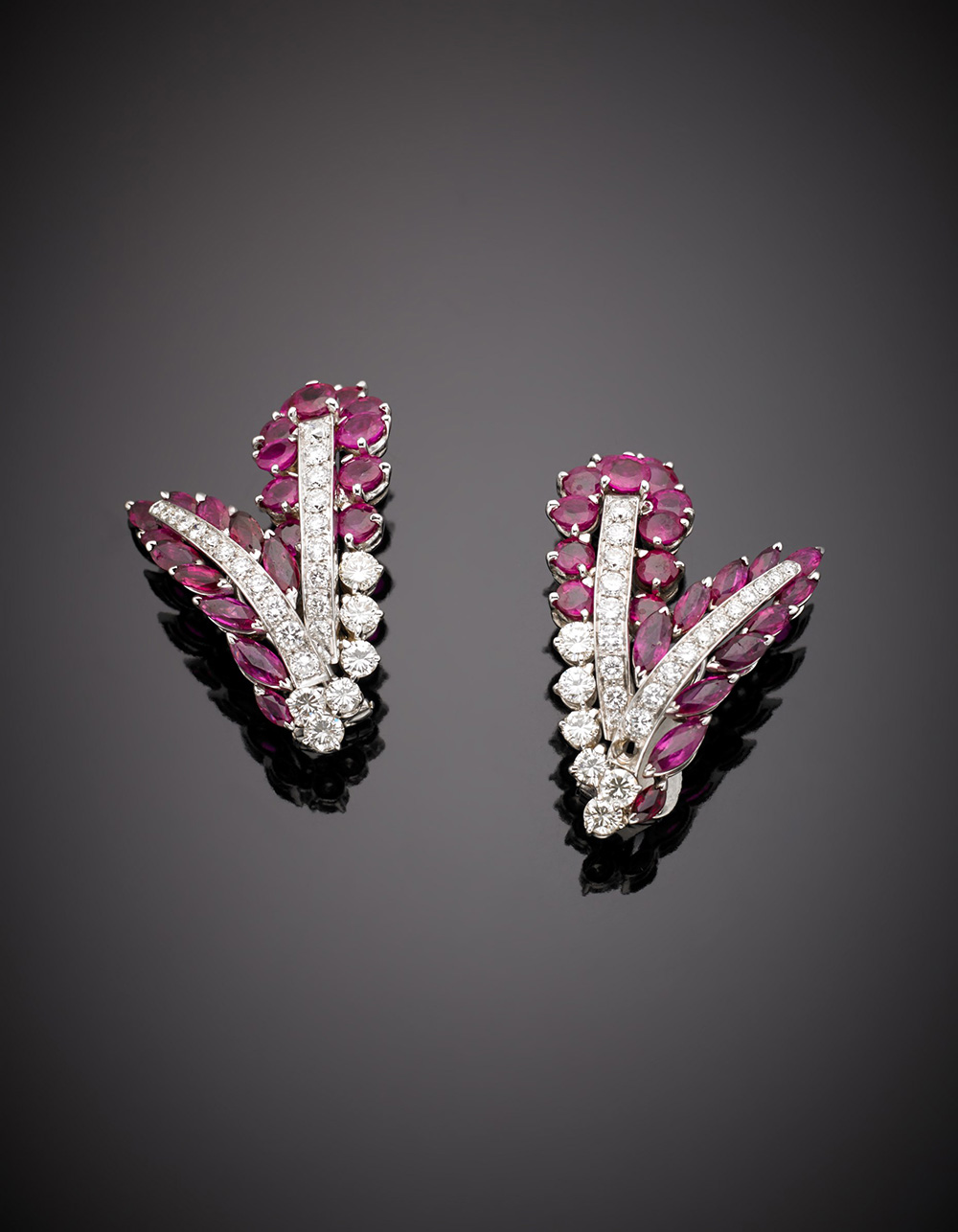 Orecchini con clip e perno in oro bianco e diamanti con rubini rotondi e a navette, g.23,10 lungh. cm 3,6 circa (diamante mancante) White gold, diamond and ruby clip earrings, g.23,10 length. cm 3,6 circa (diamond deficient)