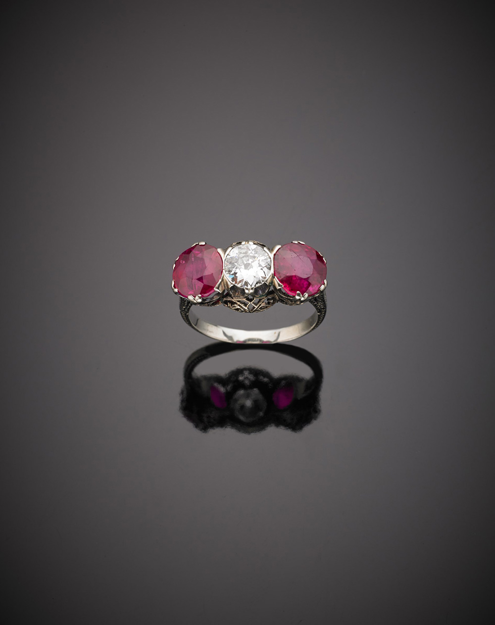 Anello in argento con due rubini rotondi sintetici ai lati di un diamante rotondo taglio vecchio europeo di ct 0,90 circa, g. 4,60, misura 15/55 Silver ring with two synthetic rubies and a central old cut diamond of ct.0,90 circa, g.4,60 size 15/55
