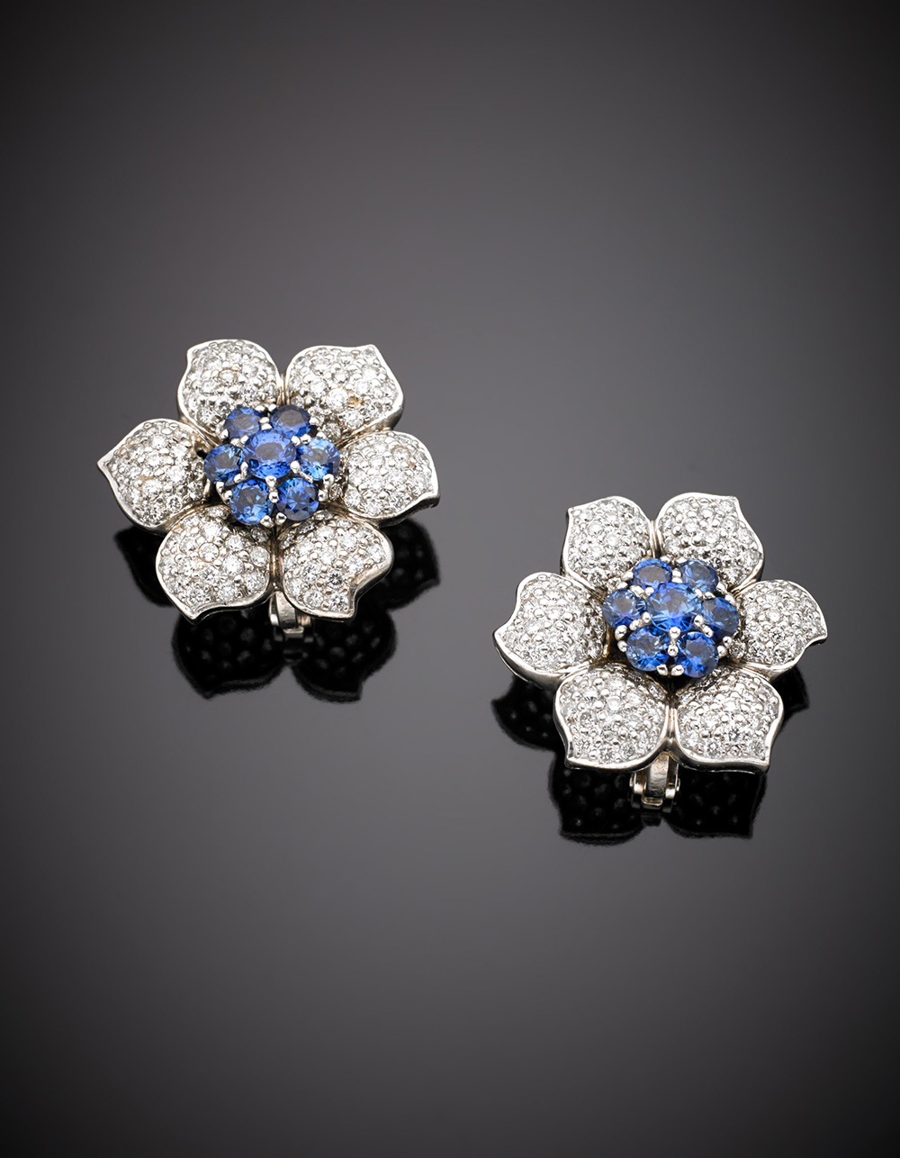 Orecchini a lobo con clip in oro bianco a guisa di fiori con pavé di diamanti e zaffiri, g. 20,00, diam. cm 2,7 circa White gold sapphire and diamond pavé flower earclips, g. 20,00, diam. cm 2,7 circa