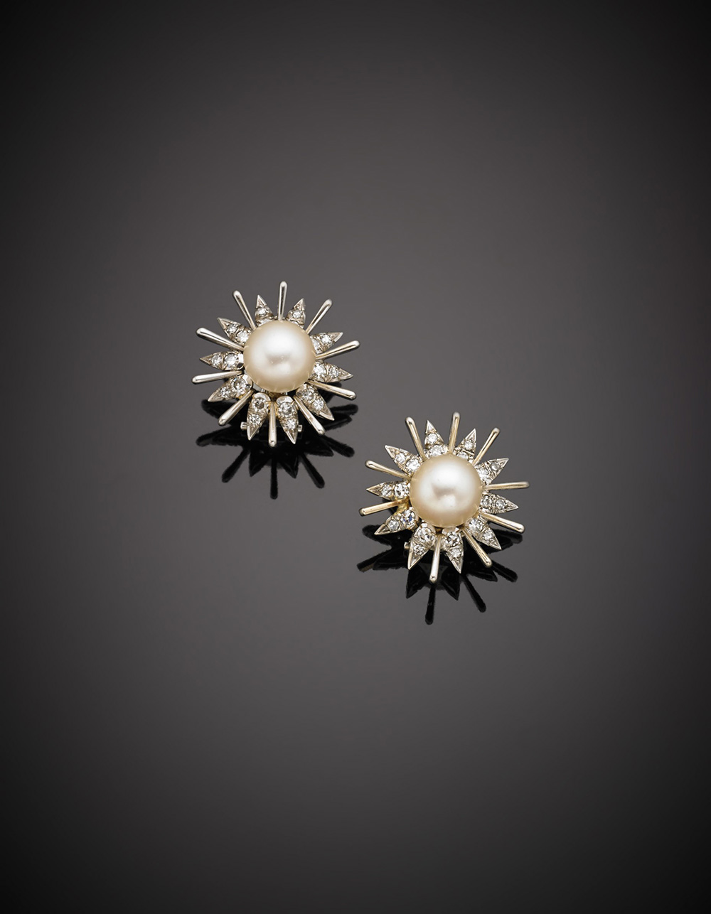 Orecchini in oro bianco a guisa di stella con diamanti, e perla centrale,...